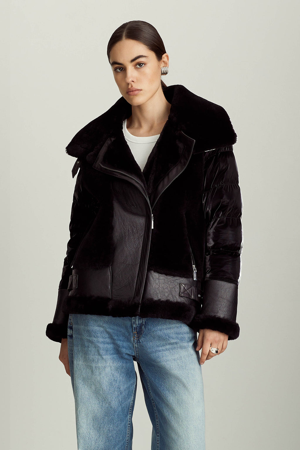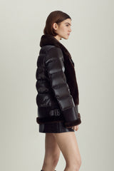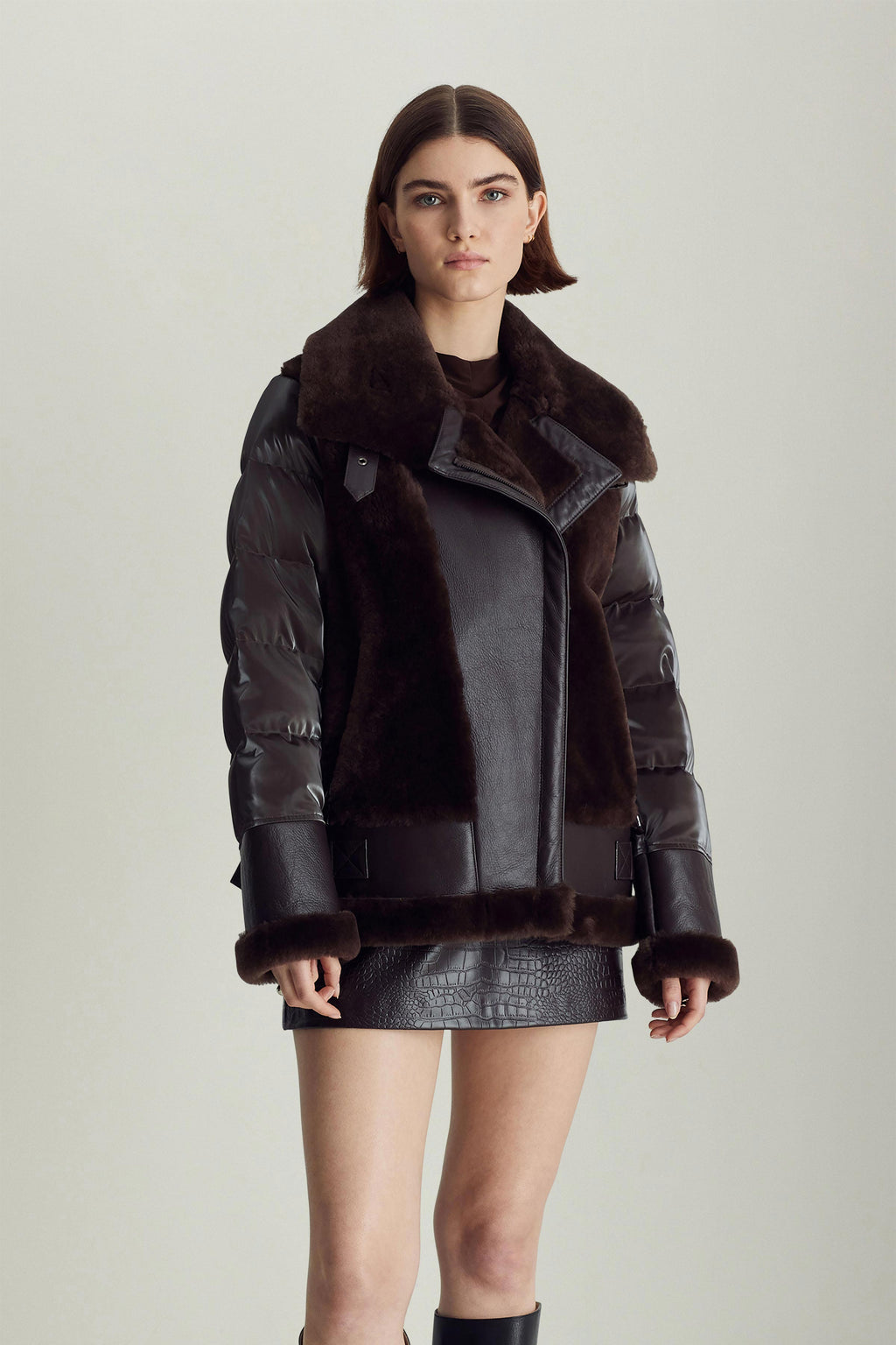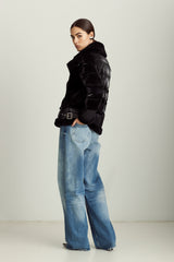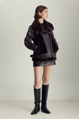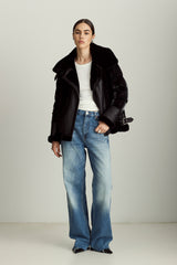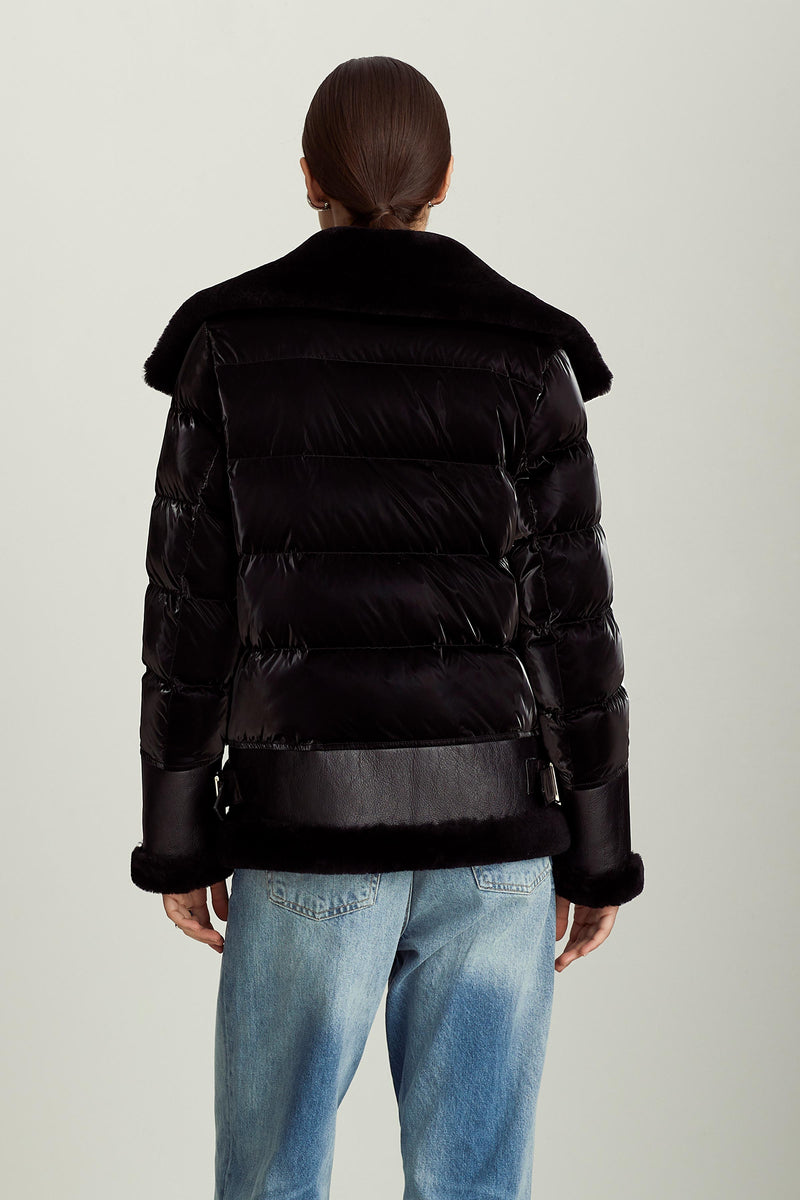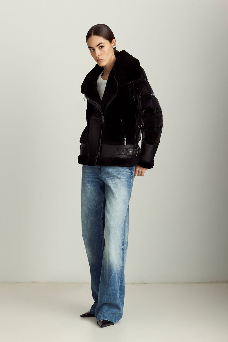 The Mel jacket blends timeless inspiration with modern design, evolving with you through different outfits, destinations, and even life stages. The contrast of soft shearling and supple leather on the front with high-gloss quilting on the back and sleeves is a distinctive spin on classic moto jackets that allows for versatile styling — from black leggings and boots to a mini dress and tights.