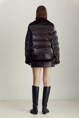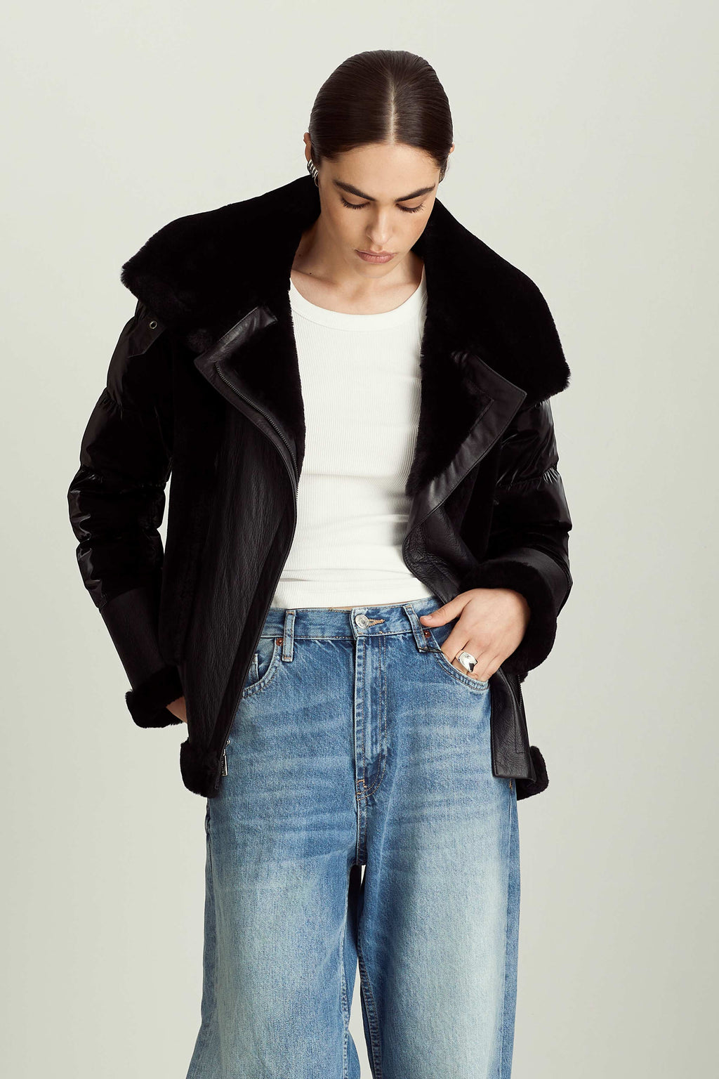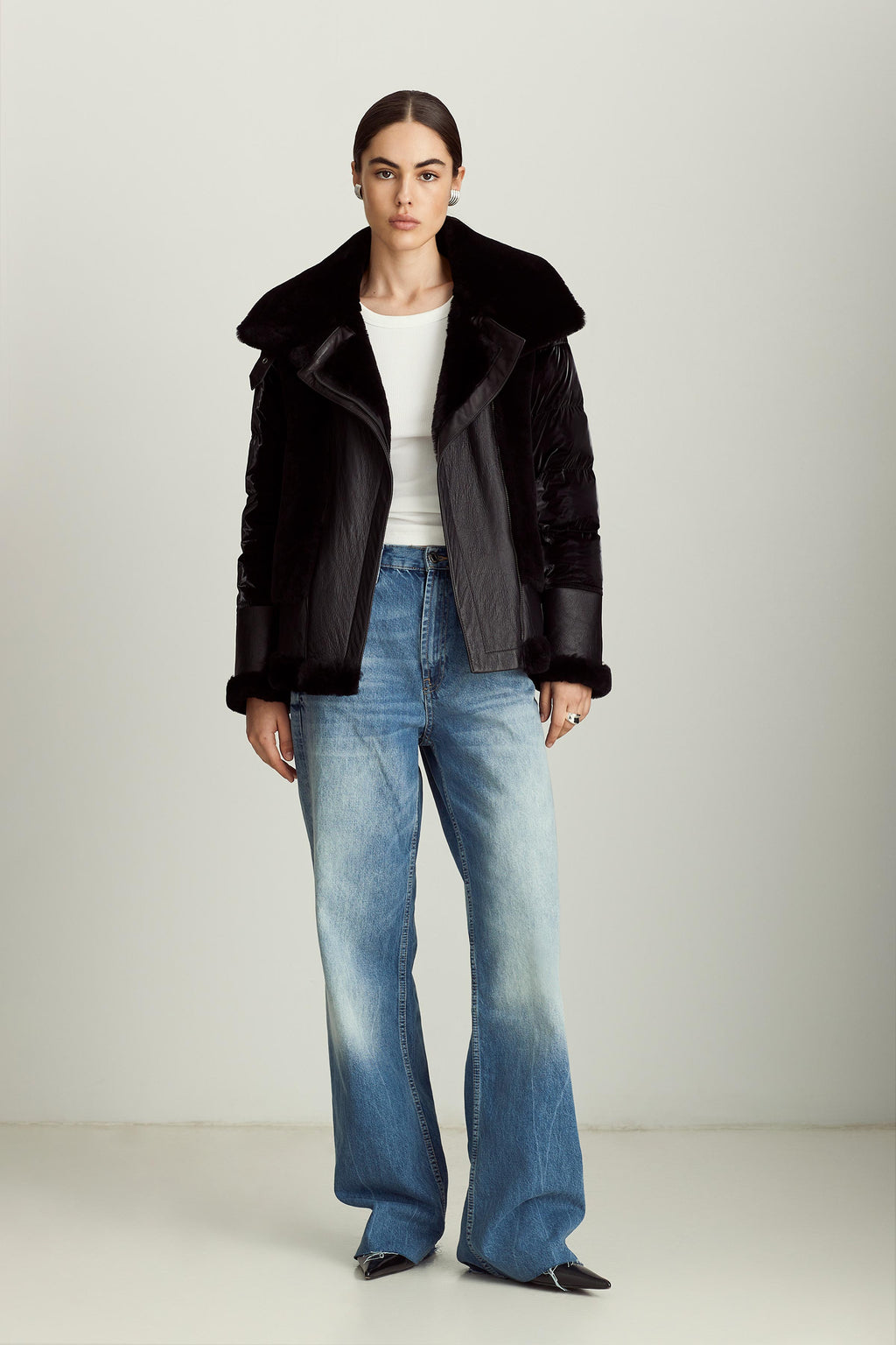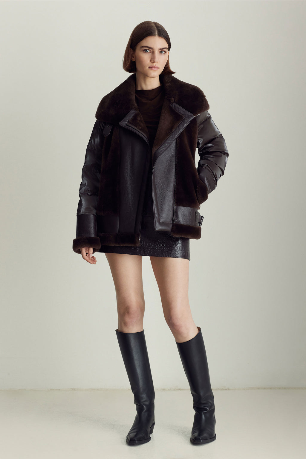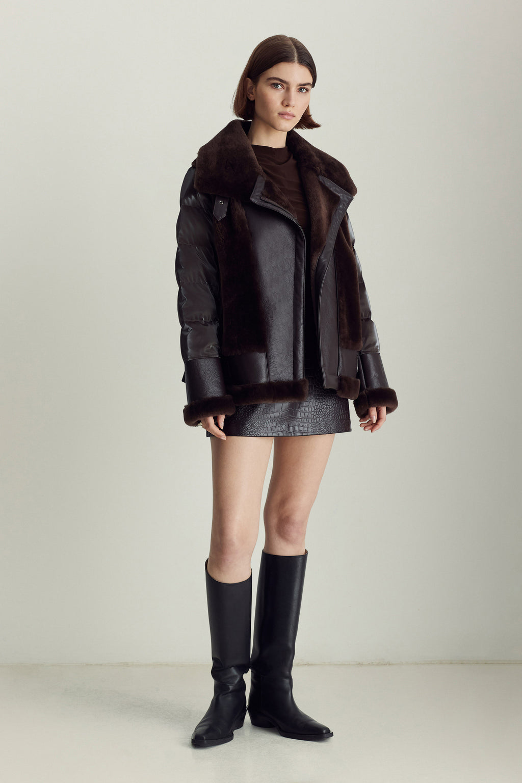 The Mel jacket blends timeless inspiration with modern design, evolving with you through different outfits, destinations, and even life stages. The contrast of soft shearling and supple leather on the front with high-gloss quilting on the back and sleeves is a distinctive spin on classic moto jackets that allows for versatile styling — from black leggings and boots to a mini dress and tights.