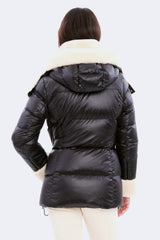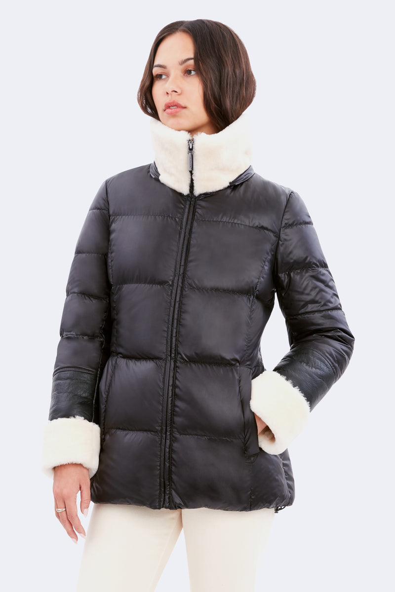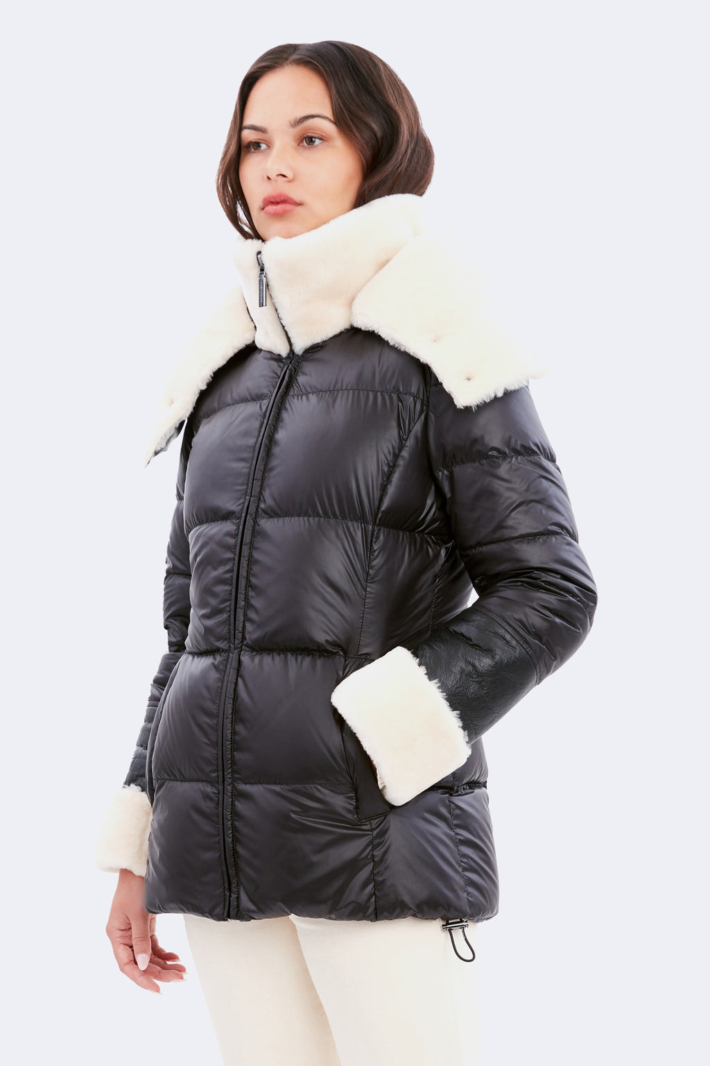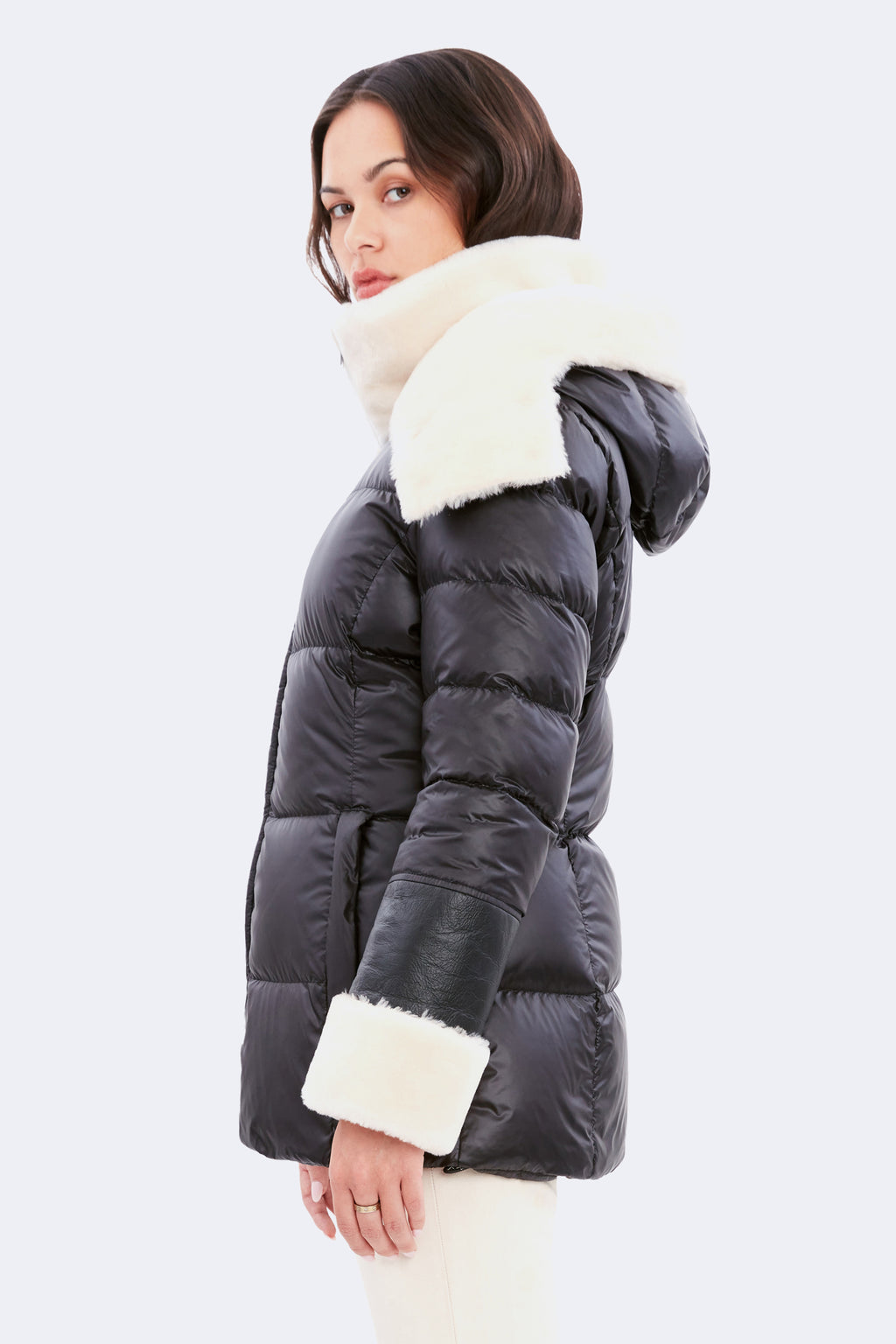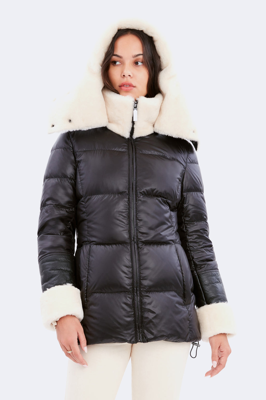 • Genuine shearling and leather mixed media panels at collar, cuff and hood front