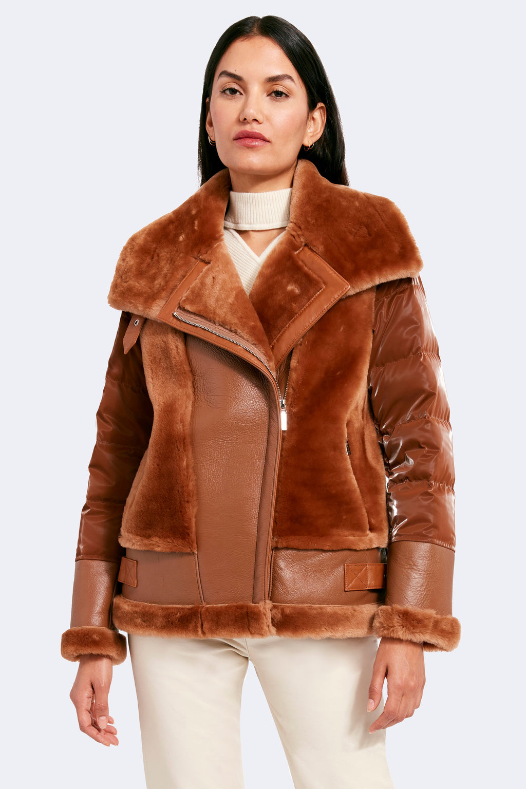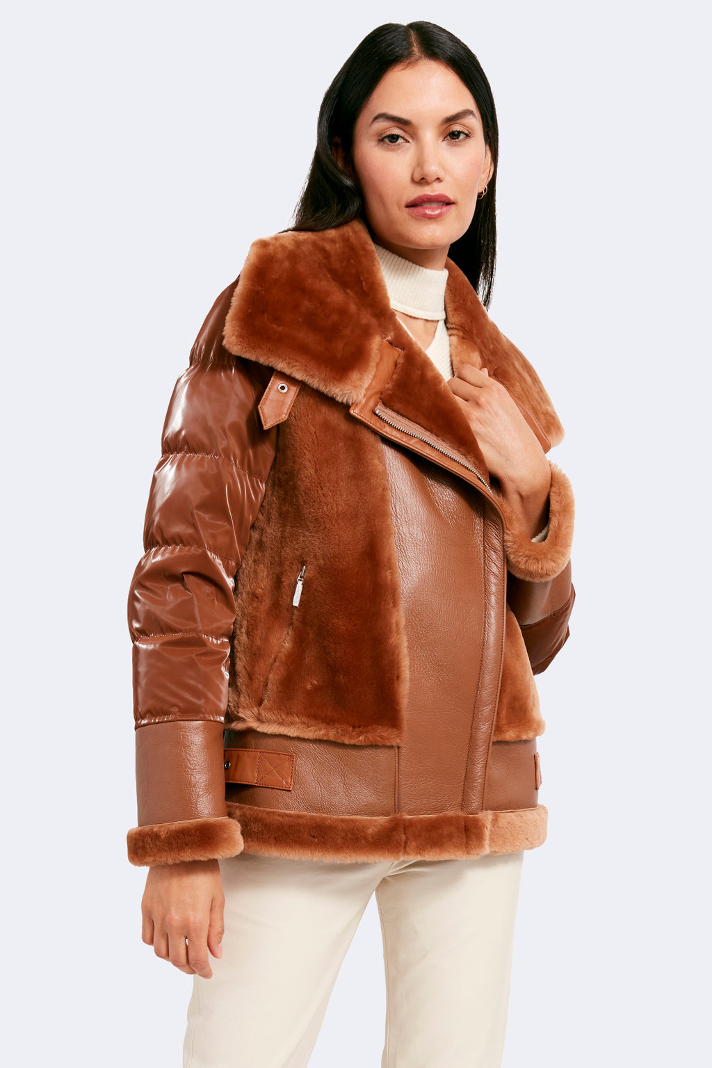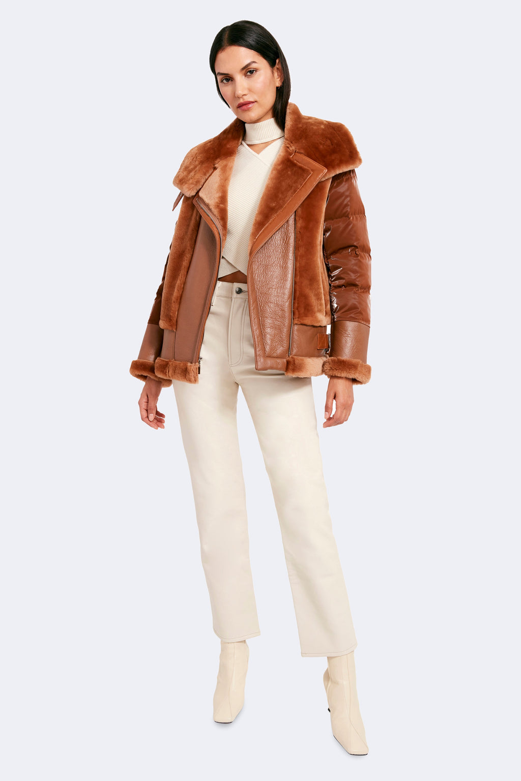 The Mel moto jacket is the hot must have item of the season. Combining luxe shearling and leather on the front with a high gloss down puffer back panel and sleeves, this jacket has it all. Perfect for this Fall and Winter season, the Mel is the ultimate street style head turner.