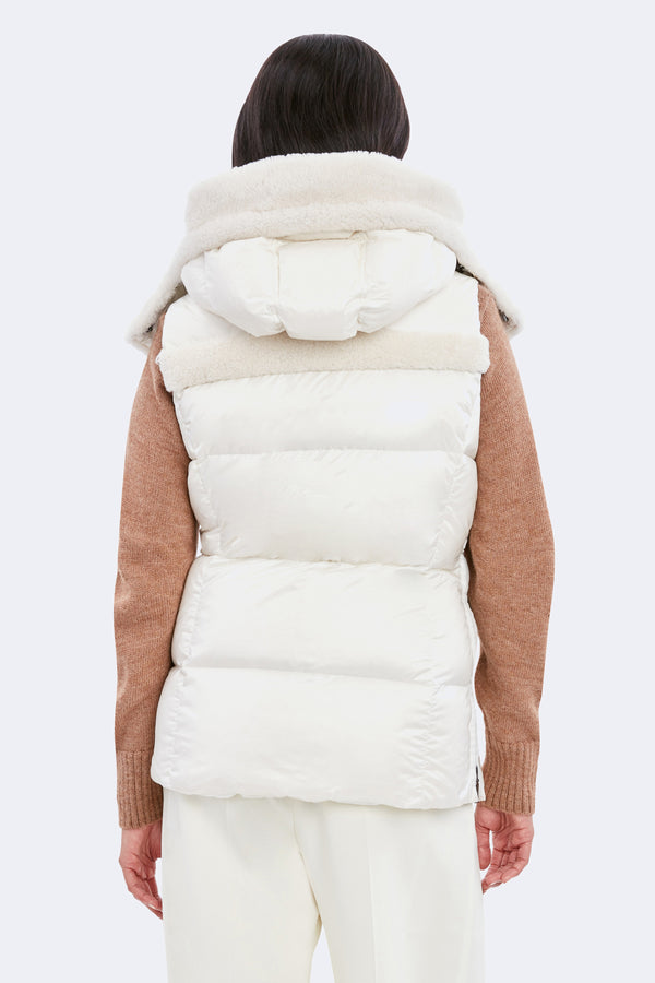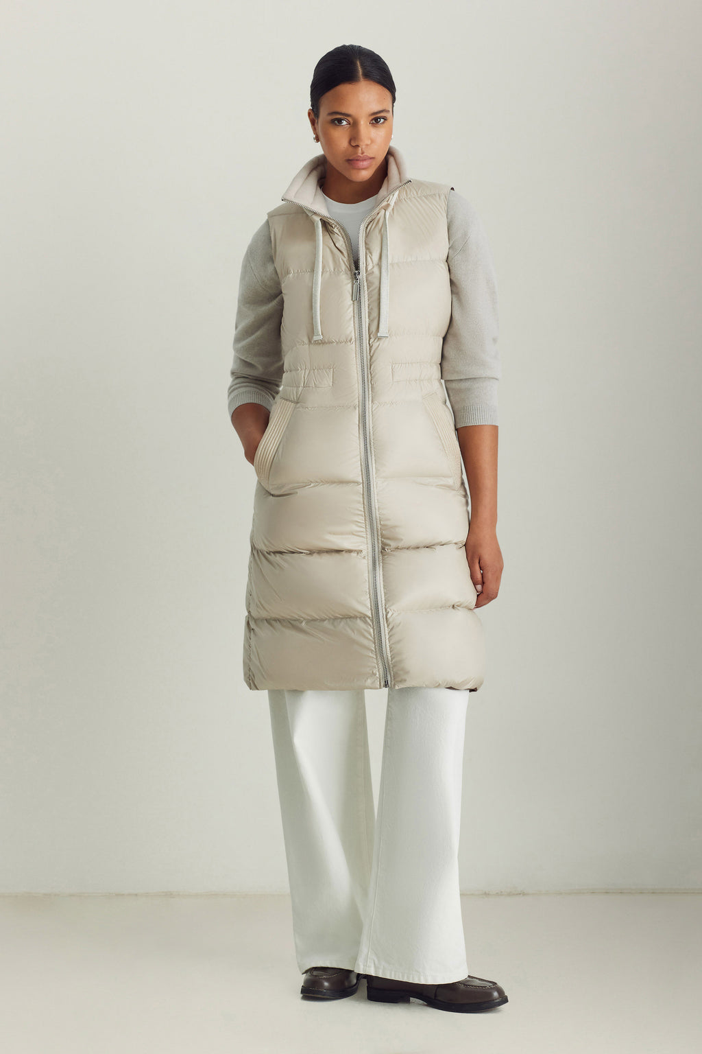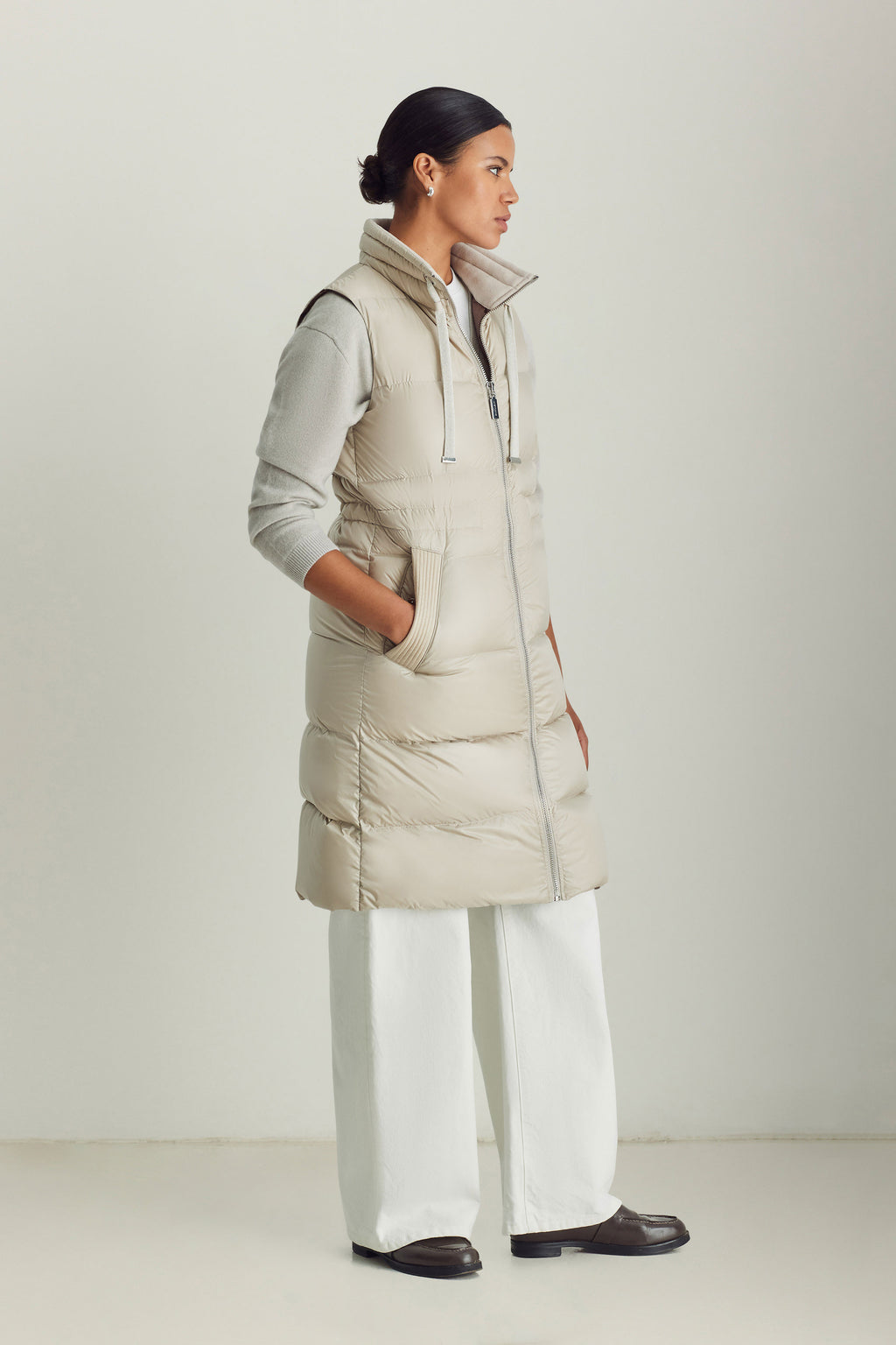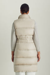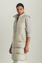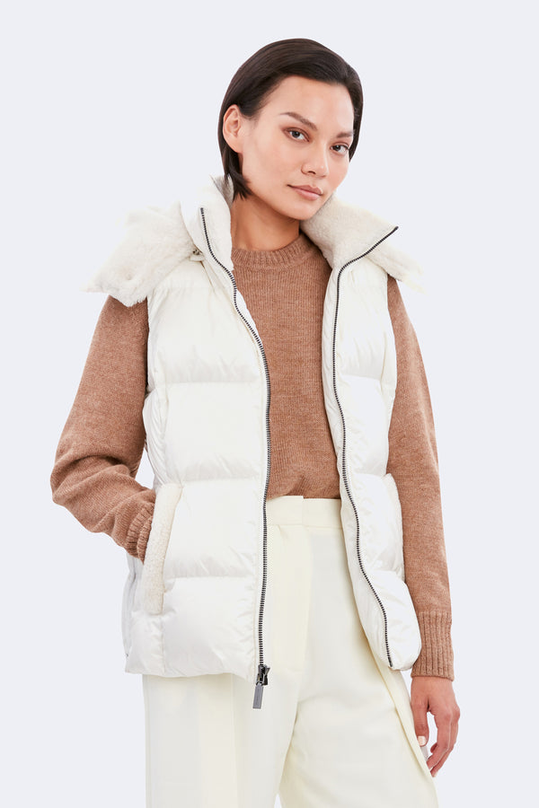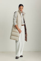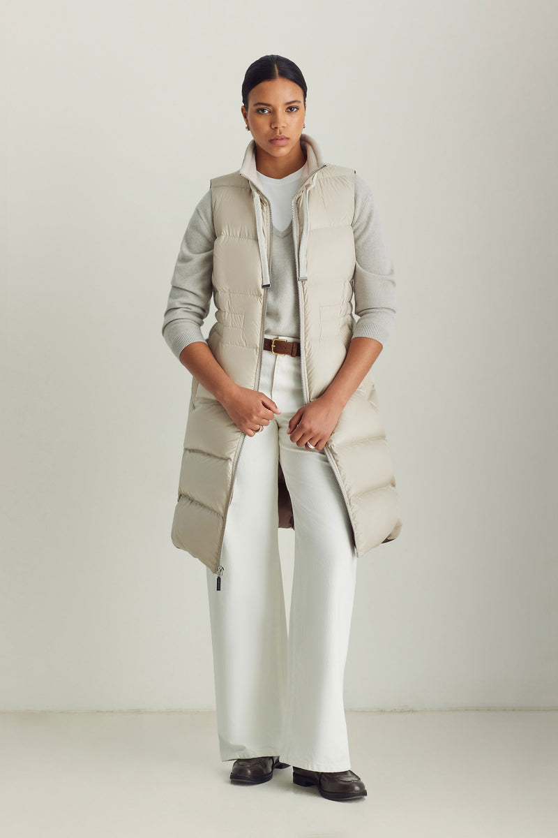 The Roma mid-length puffer vest features water and wind resistance coupled with cozy light weight down fill. An exposed zipper closure and adjustable waist cord offer a tailored fit, while the plush wool collar facing adds a touch of luxury and warmth. Ideal for layering, the Roma combines practicality with a refined edge.