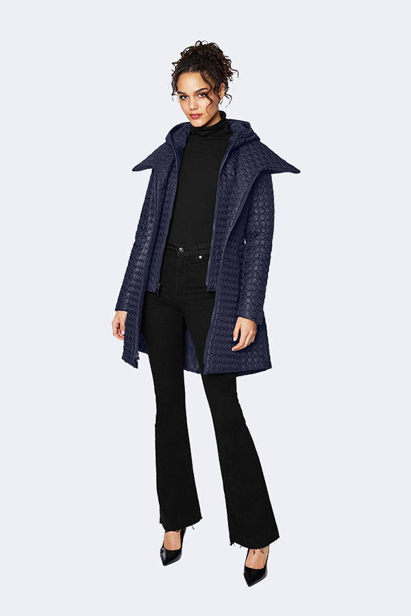 The timeless silhouette of Gwen has been modernized with features that meet the demands of the modern woman. Highlighting a fan collar, an attached hood, and a zipped-in insulated bib, this jacket is crafted for any season. The signature quilted shell fabric with a matte finish offers lightweight coverage, while the cinched waist adds a feminine touch.