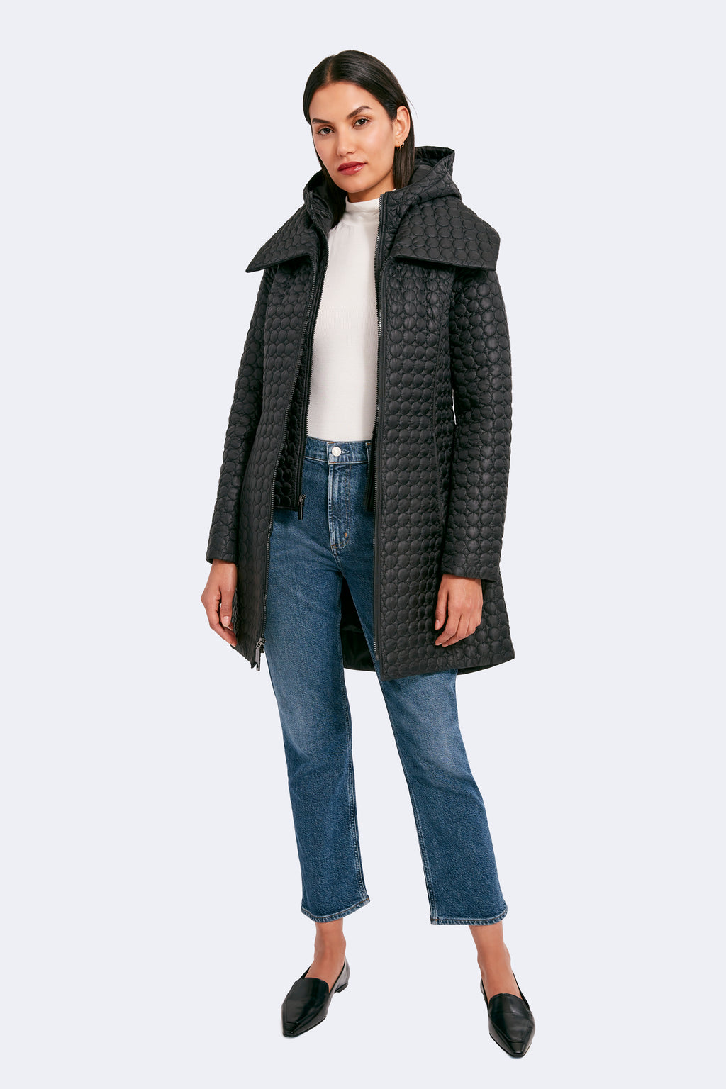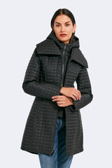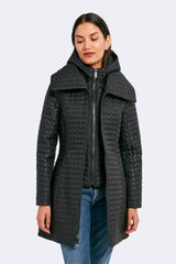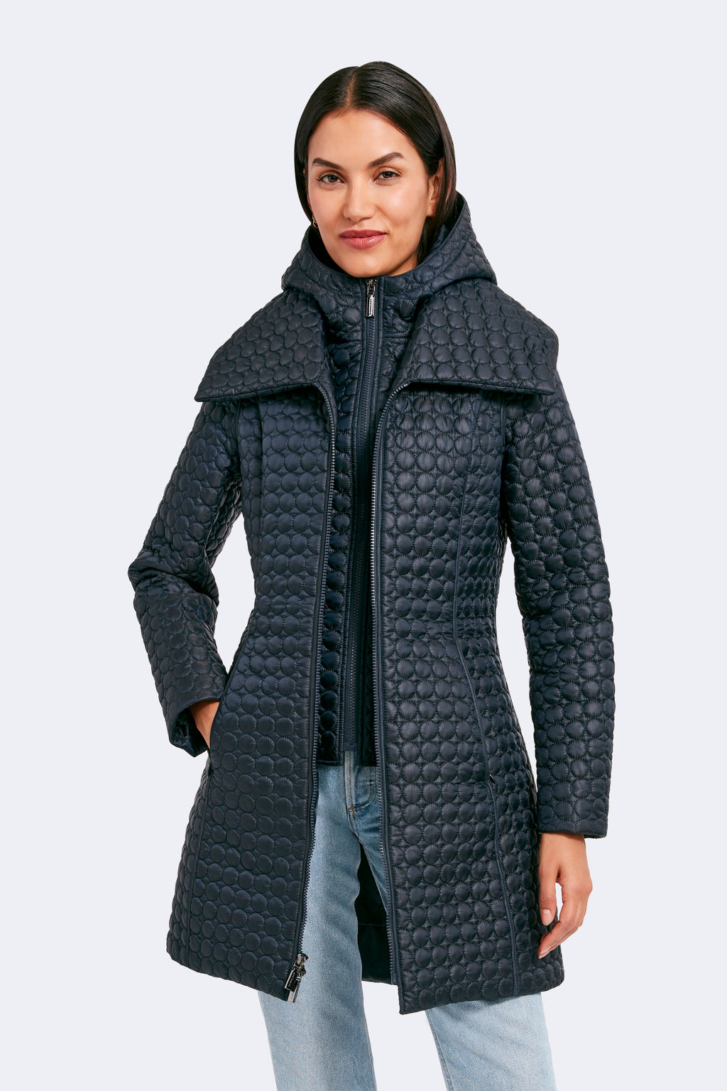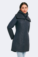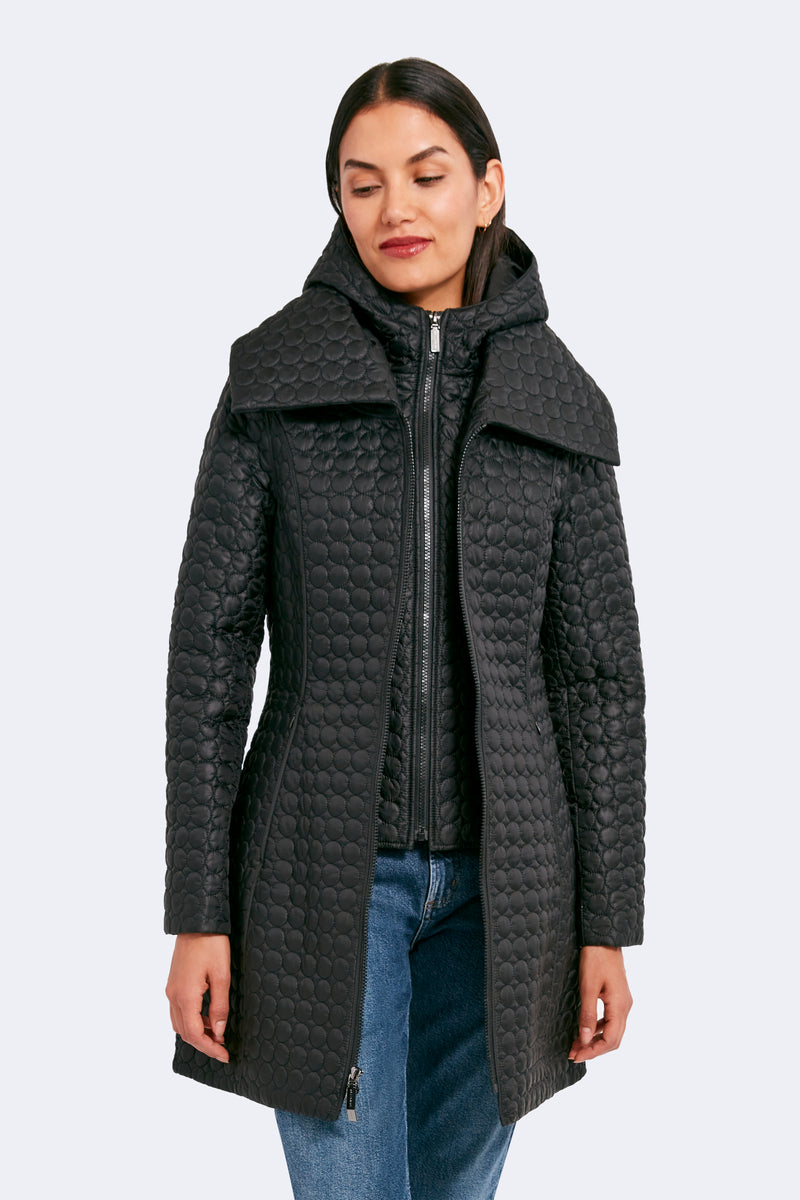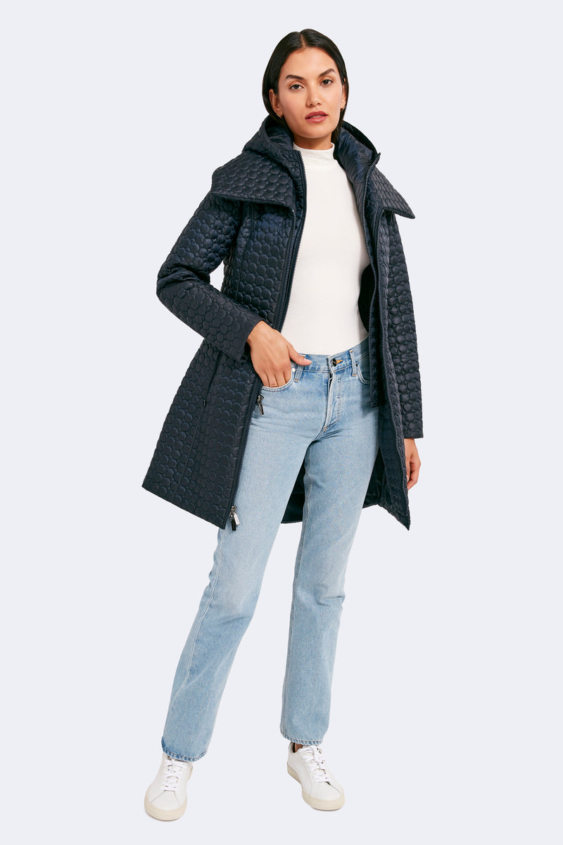 The timeless silhouette of Gwen has been modernized with features that meet the demands of the modern woman. Highlighting a fan collar, an attached hood, and a zipped-in insulated bib, this jacket is crafted for any season. The signature quilted shell fabric with a matte finish offers lightweight coverage, while the cinched waist adds a feminine touch.