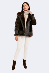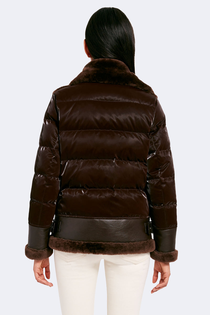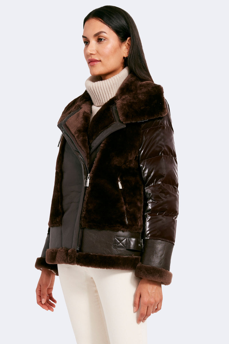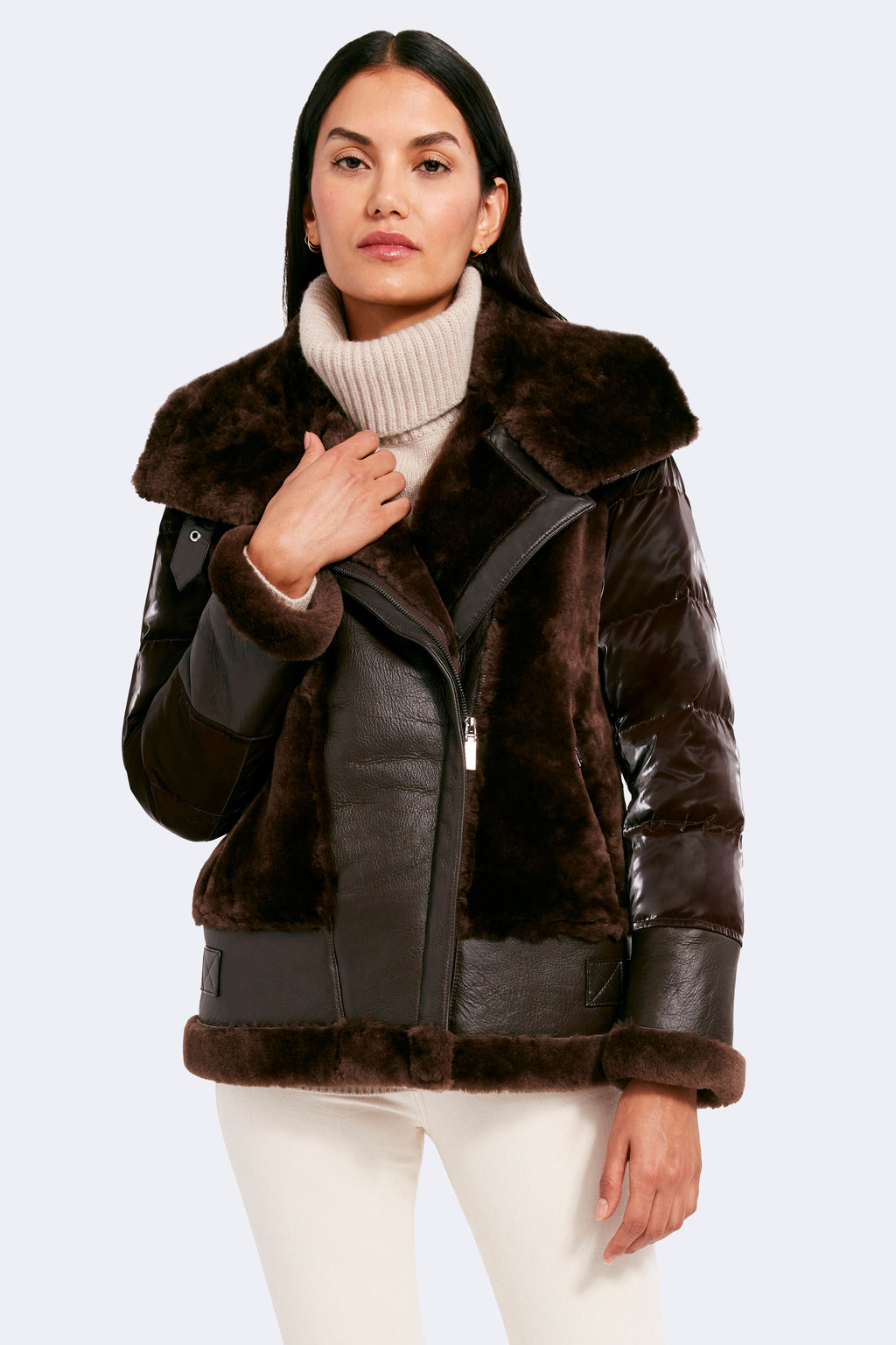 The Mel jacket blends timeless inspiration with modern design, evolving with you through different outfits, destinations, and even life stages. The contrast of soft shearling and supple leather on the front with high-gloss quilting on the back and sleeves is a distinctive spin on classic moto jackets that allows for versatile styling — from black leggings and boots to a mini dress and tights.